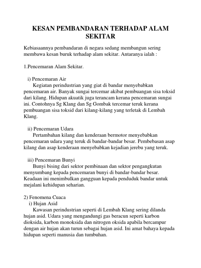 Bina kawasan perindustrian jauh daripada kawasan perumahan dan pastikan kawasan industri ini mempunyai tempat pembuangan sisa dan saluran longkang yang teratur dan baik. Garispanduan penilaian kesan alam sekitar bagi negara brunei darussalam juga disediakan sebagai pelengkap kepada garispanduan kawalan pencemaran bagi pembangunan perindustrian di negara brunei darussalam. Documents similar to kesan pembangunan perindustrian ke atas alam sekitar. Terms in this set (9). Berpunca daripada aktiviti manusia yang tidak bertanggungjawab.