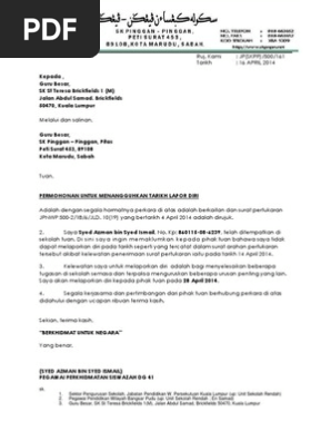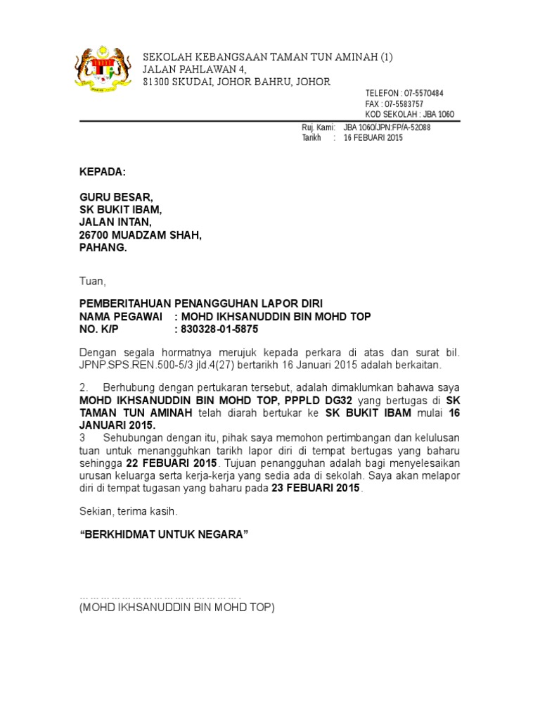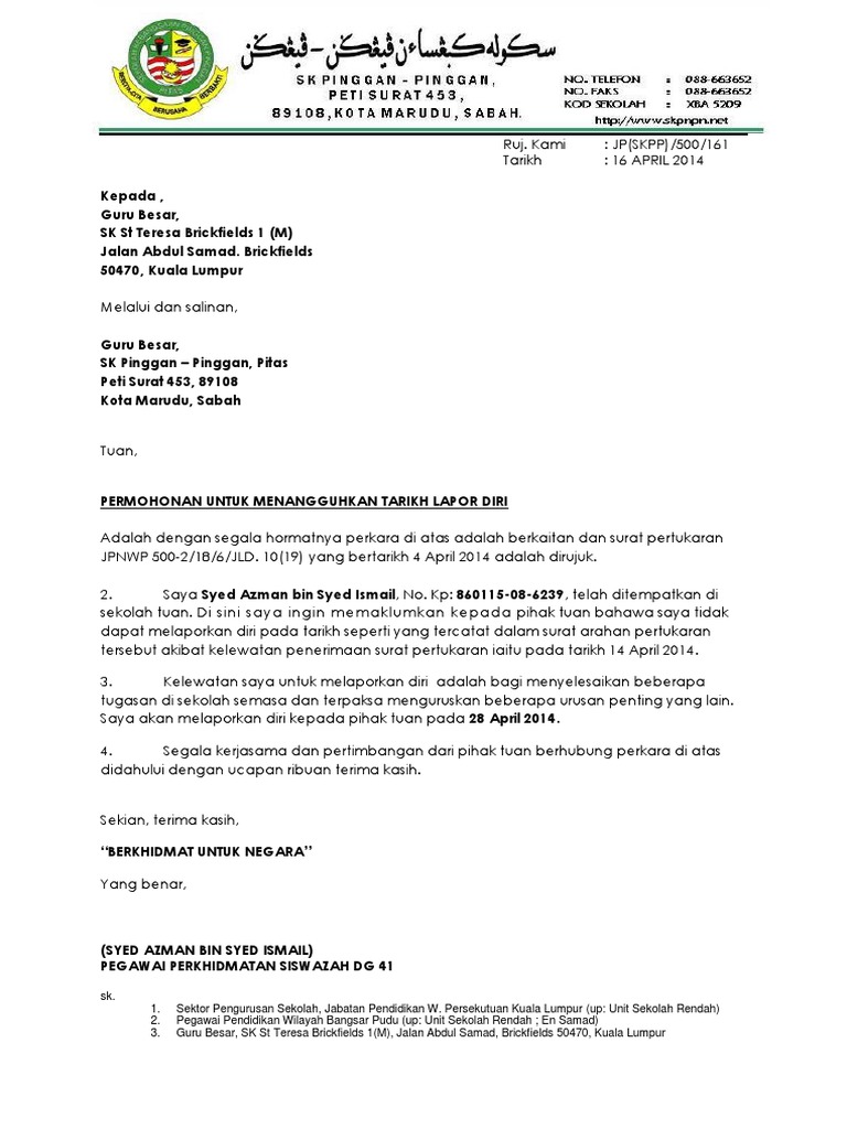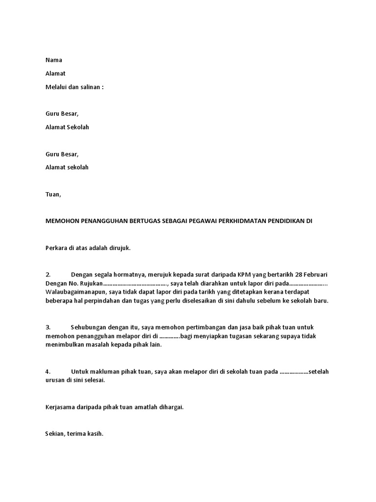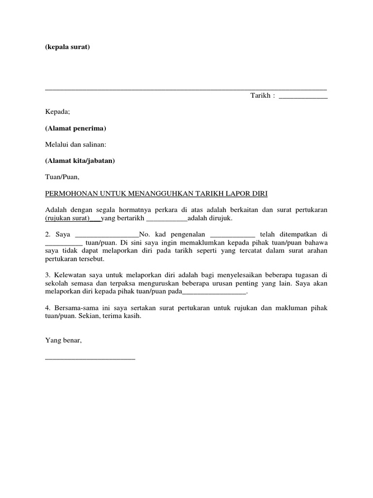 Tekan butang ⇓ untuk muat turun. 3sehubungan dengan itu, pihak saya memohon pertimbangan dan kelulusan tuan untuk menangguhkan tarikh lapor diri pegawai berkenaan di tempat bertugas yang baharu sehingga. Entah bagi yang ingin resign dari tempat kerja di perusahaan yang selama ini ia bernaung di bawahnya atau dari jabatan tertentu. Jika anda ingin mengundurkan diri dari keanggotaan maupun kepengurusan osis, maka anda bisa membuat surat pengunduran diri seperti contoh di bawah ini. Dengan segala hormatnya saya diarah merujuk kepada perkara di atas dan surat bil.( ) bertarikh ( ) adalah berkaitan. Namun, tidak menutup kemungkinan dengan alasan. Wan nor asnidah bt wan abdullah sekolah kebangsaan 2 taman selayang, 68100 batu caves selangor. Contoh surat permohonan penangguhan lapor diri / bertugas. Dengan adanya surat pengunduran diri, berarti perusahaan akan menyiapkan pengganti anda.terlebih jika posisi jabatan yang anda pegang cukup. Fungsinya adalah untuk melegalkan status tanggung jawab di perusahaan dan persyaratan administratif. Mengundurkan diri dari sebuah perusahaan bukanlah hal yang mudah. Surat pengunduran diri /resign sangat dibutuhkan oleh anda sebagai karyawan. Surat tangguh lapor diri documents via dokumen.tips lampiran psas pk plsp 06 via slideshare contoh surat rasmi penangguhan lapor diri via contohxsurat.co surat tangguh tugas pertukaran via slideshare papagedebe :