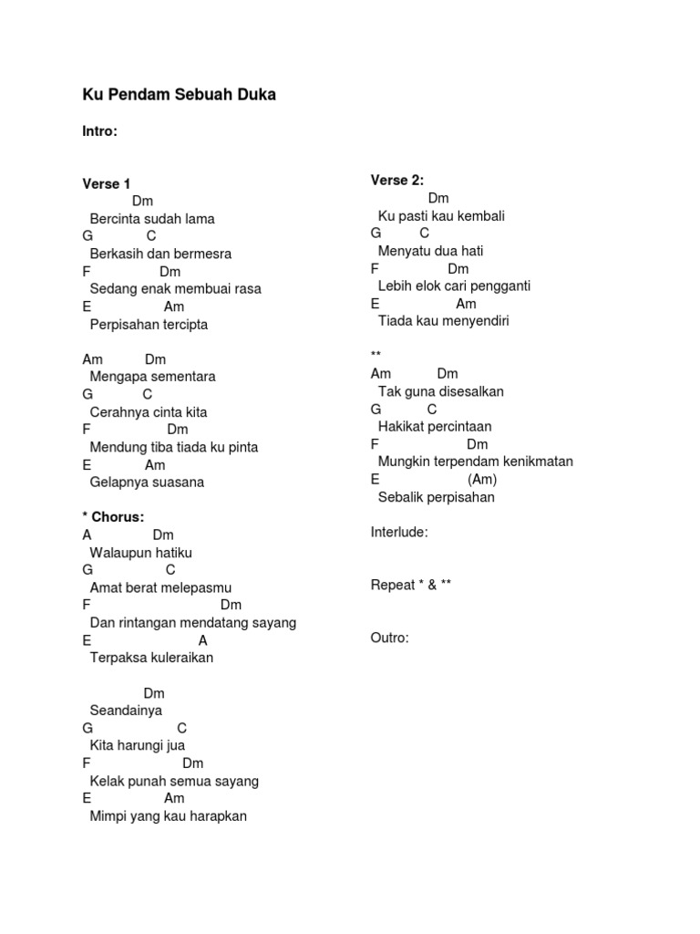 Original lyrics of ku pendam sebuah duka song by khatijah ibrahim. Ku sangka siang kiranya malam. Fm bercinta sudah lama bb eb berkasih dan bermesra cm fm sedang enak membuai rasa g cm perpisahan tercipta cm fm mengap. Comment and share your favourite lyrics. Ku pendam sebuah duka merupakan album hasil nukilan khadijah ibrahim yang dikeluarkan pada tahun 1987 melalui syarikat rakaman warner music.